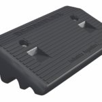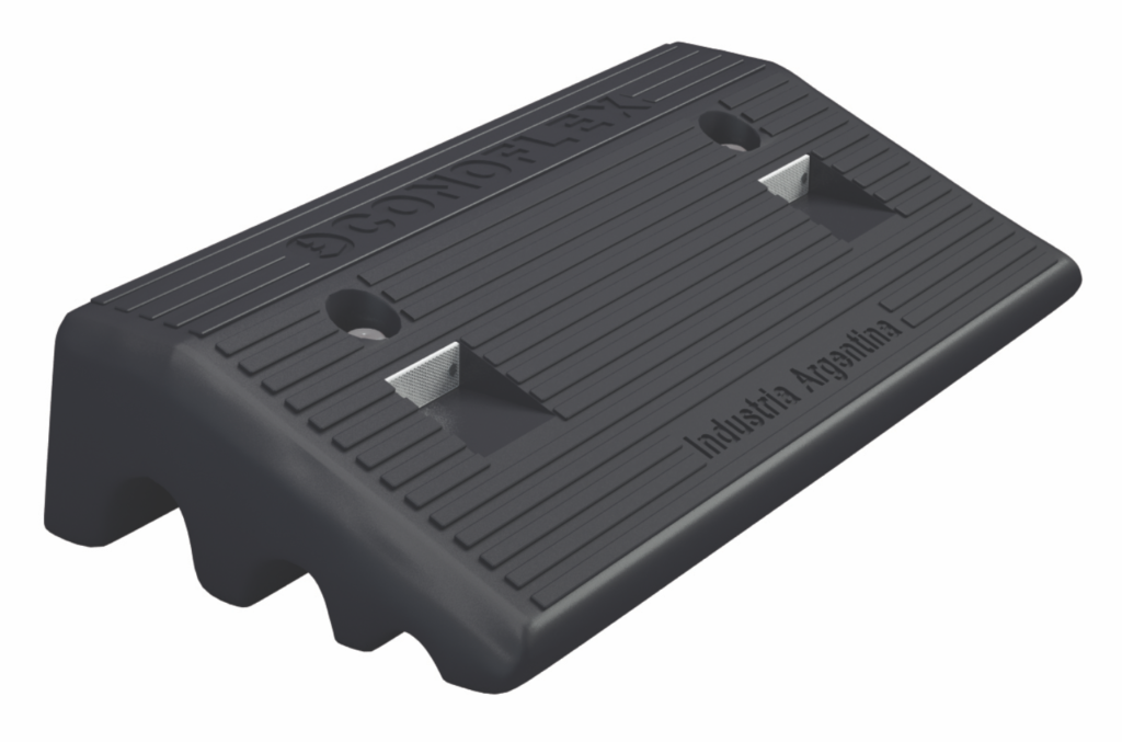 Accesorio plástico para subidas de cordón, fabricado en material PVC flexible de color negro con filtro UV para protección solar. Conformado en “una sola pieza”. Medidas: 50 x 24 cm y 10 cm de altura. Provisto de 3 pasa cables, el primero de Ø45 mm, el segundo de Ø27 mm, y el tercero de Ø15 mm de diámetro. Cuenta con 2 orificios para fijación con anclaje mecánico al suelo. Presenta 2 lentes acrílicos prismáticos de 5 x 2 cm. Su largo de pisada es de 24 cm y su peso es de 10 kg.
