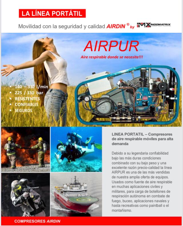 LINEA PORTATIL - Compresores de aire respirable móviles para alta demanda Debido a su legendaria confiabilidad bajo las más duras condiciones combinado con su bajo peso y una excelente razón precio-calidad la línea AIRPUR es una de las más vendidas de nuestra amplia oferta de equipos. Usados como fuente de aire respirable en muchas aplicaciones civiles y militares, para carga de botellones de respiración autónoma en combate de fuego, buceo, aplicaciones navales y hasta recreativas como paintoall o el montañismo.