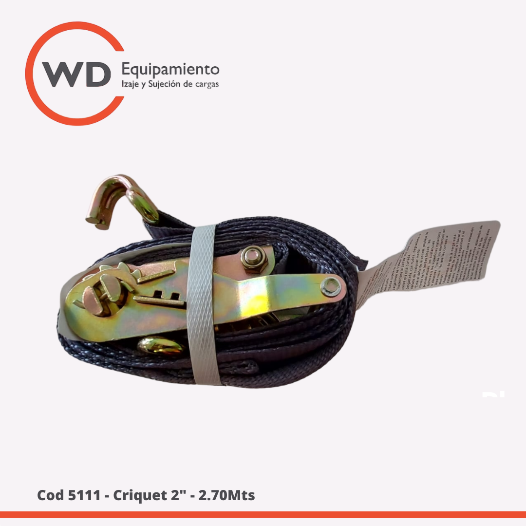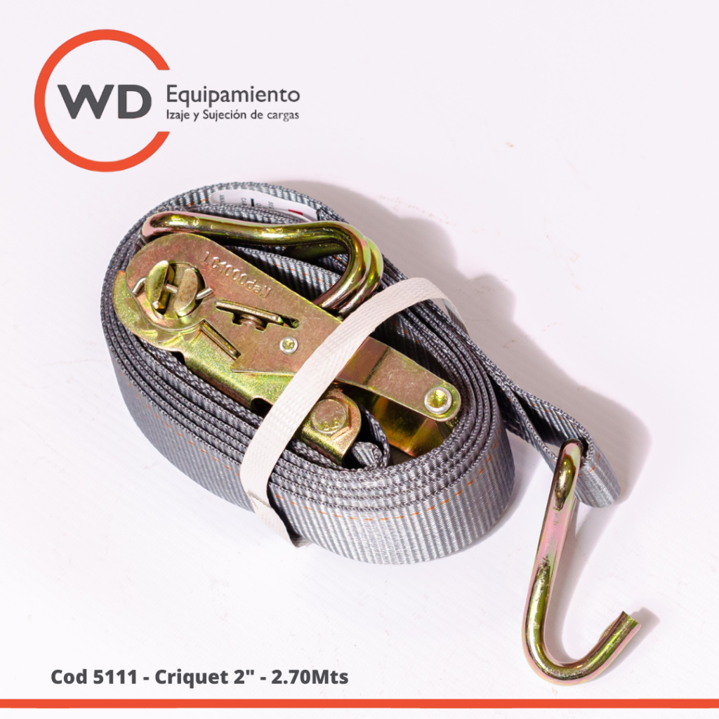 Marca WD - Código 5111 10 equipos CRIQUET RATCHER DE 2” X 2,70MTRS C/GANCHO DE ACERO UNIVERSAL. Confeccionados con Poliéster de alta tenacidad. Coeficiente de Seguridad: 3 Cumple con NORMA IRAM 5379-1 Carga Mínima: 666 Kg Carga Máxima: 1998 Kg Estos criquets están diseñados para ser usados en cualquier requerimiento de sujeción de carga en plataformas o vehículos abiertos. Los conjuntos tienen un extremo corto. Todos los conjuntos cuentan con una etiqueta indicando su Carga Límite de Trabajo de acuerdo a los requerimientos del Departamento De Transporte (DOT) y de los estándares recomendados por la “Web Sling & Tie Down Association” (WSTDA). Fabricados bajo norma IRAM 5379-1. Los equipos criquets para sujeción aplican en varios sectores, y su uso es versátil, tenemos opciones de ancho de cinta, largo, capacidad, terminación de gancho.