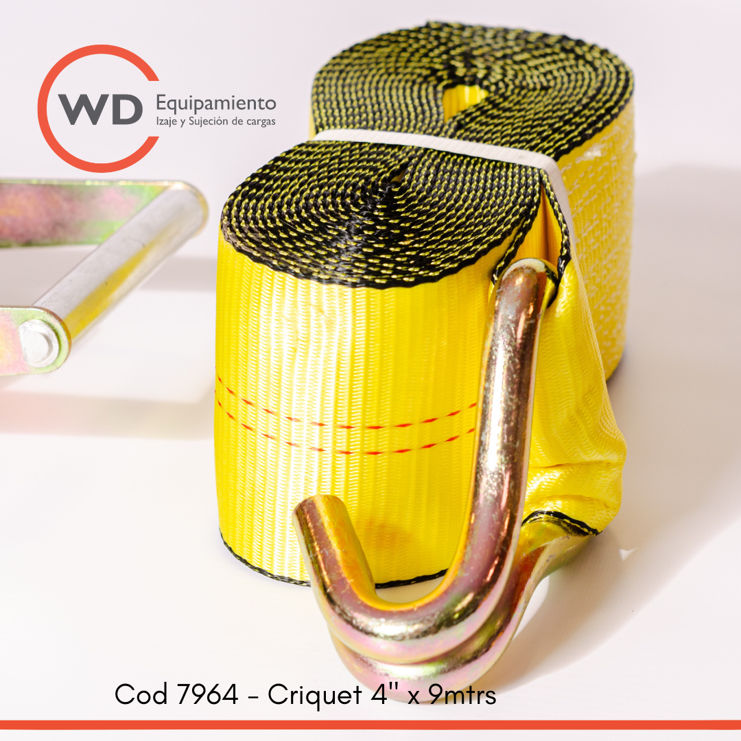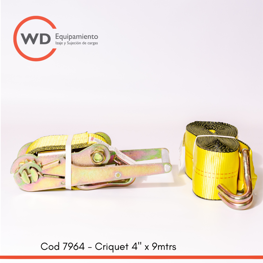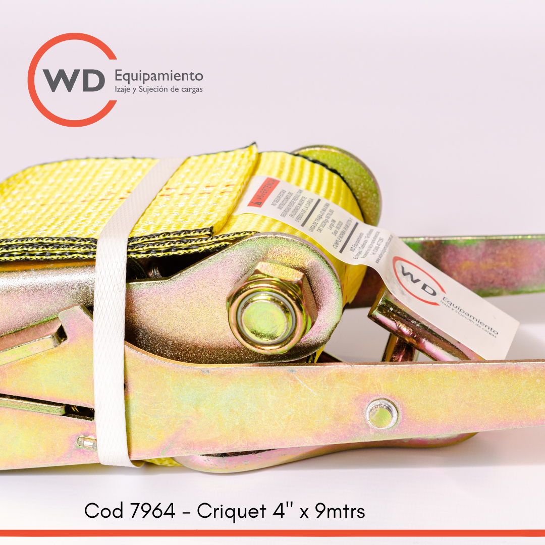 Marca WD - Código 7964 Equipos CRIQUET RATCHER DE 4” X 9 MTRS C/GANCHO DE ACERO UNIVERSAL. Confeccionados con Poliéster de alta tenacidad. Coeficiente de Seguridad: 3 Cumple con NORMA IRAM 5379-1 Carga Mínima: 3000 Kg Carga Máxima: 9000 Kg Estos criquets están diseñados para ser usados en cualquier requerimiento de sujeción de carga en plataformas o vehículos abiertos. Los conjuntos tienen un extremo corto. Todos los conjuntos cuentan con una etiqueta indicando su Carga Límite de Trabajo de acuerdo a los requerimientos del Departamento De Transporte (DOT) y de los estándares recomendados por la “Web Sling & Tie Down Association” (WSTDA). Fabricados bajo norma IRAM 5379-1. Los equipos criquets para sujeción aplican en varios sectores, y su uso es versátil, tenemos opciones de ancho de cinta, largo, capacidad, terminación de gancho.