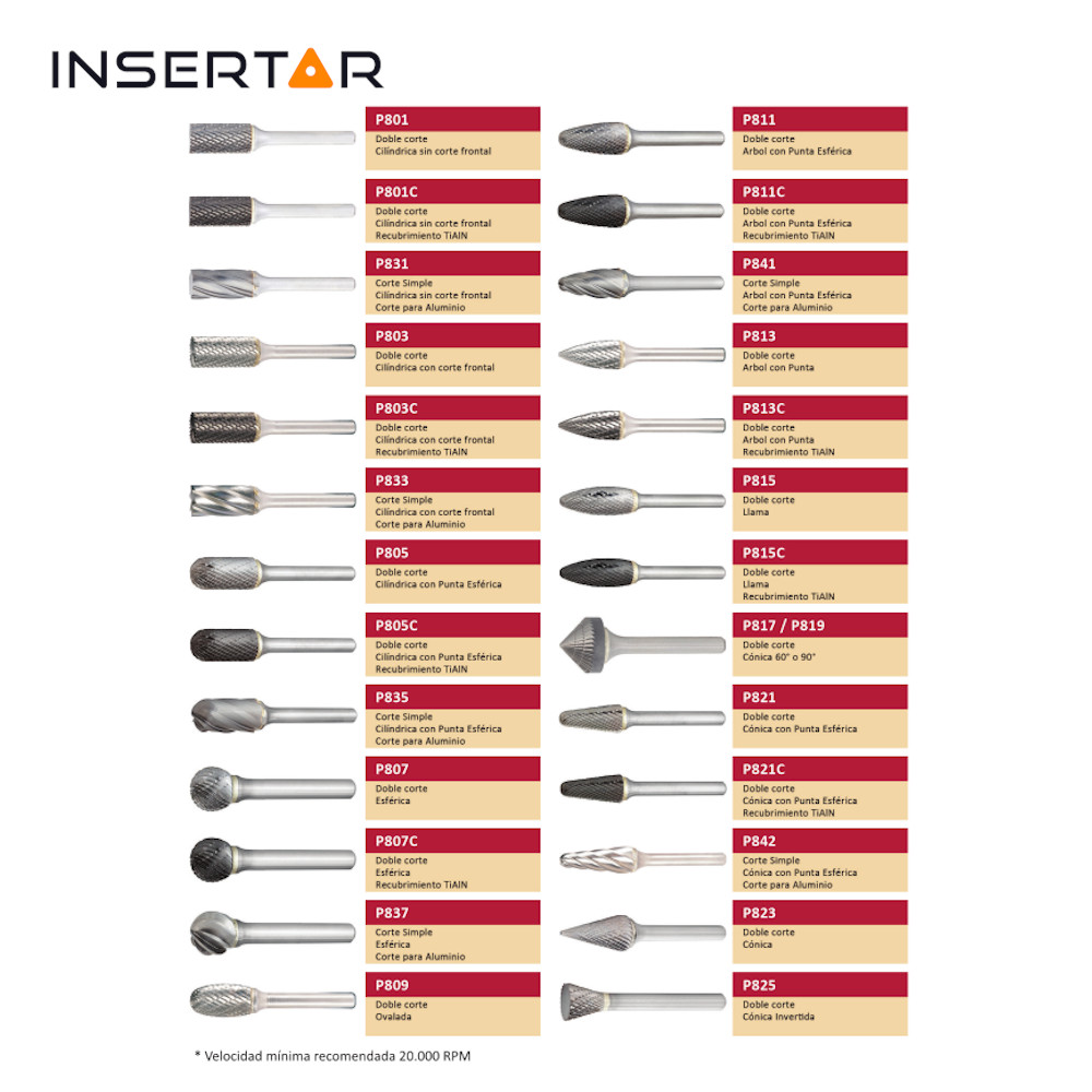 Amplio catálogo de limas rotativas de metal duro para amoladoras rectas (eléctricas o neumáticas). Disponibles en una gran variedad de formas para diversos trabajos y distintos tipos de corte para cada material.