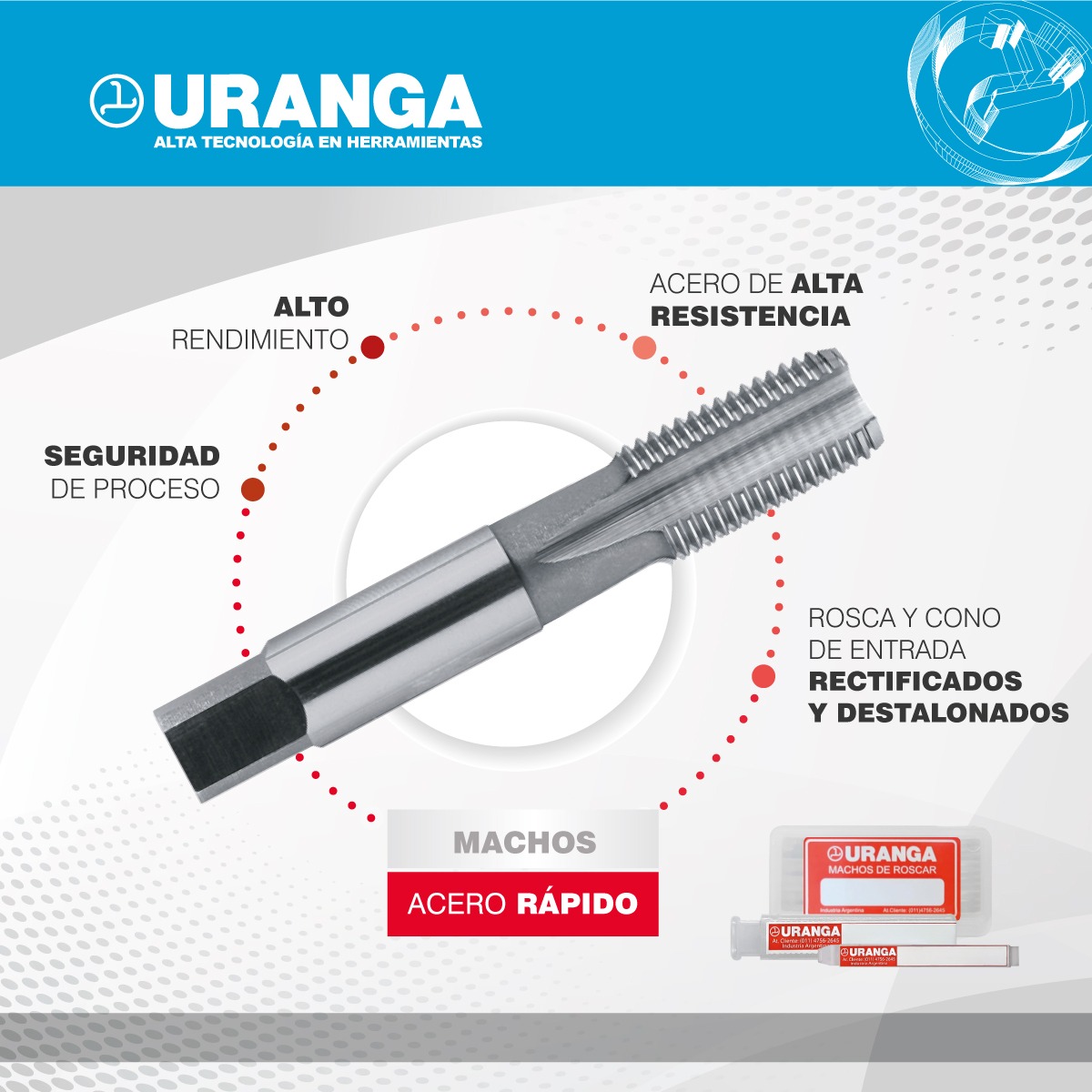 URANGA ofrece una completa línea de machos de acero rápido HSS Y HSSE. Conserva la dureza y resistencia al desgaste y mantiene los filos durante la operación de corte.