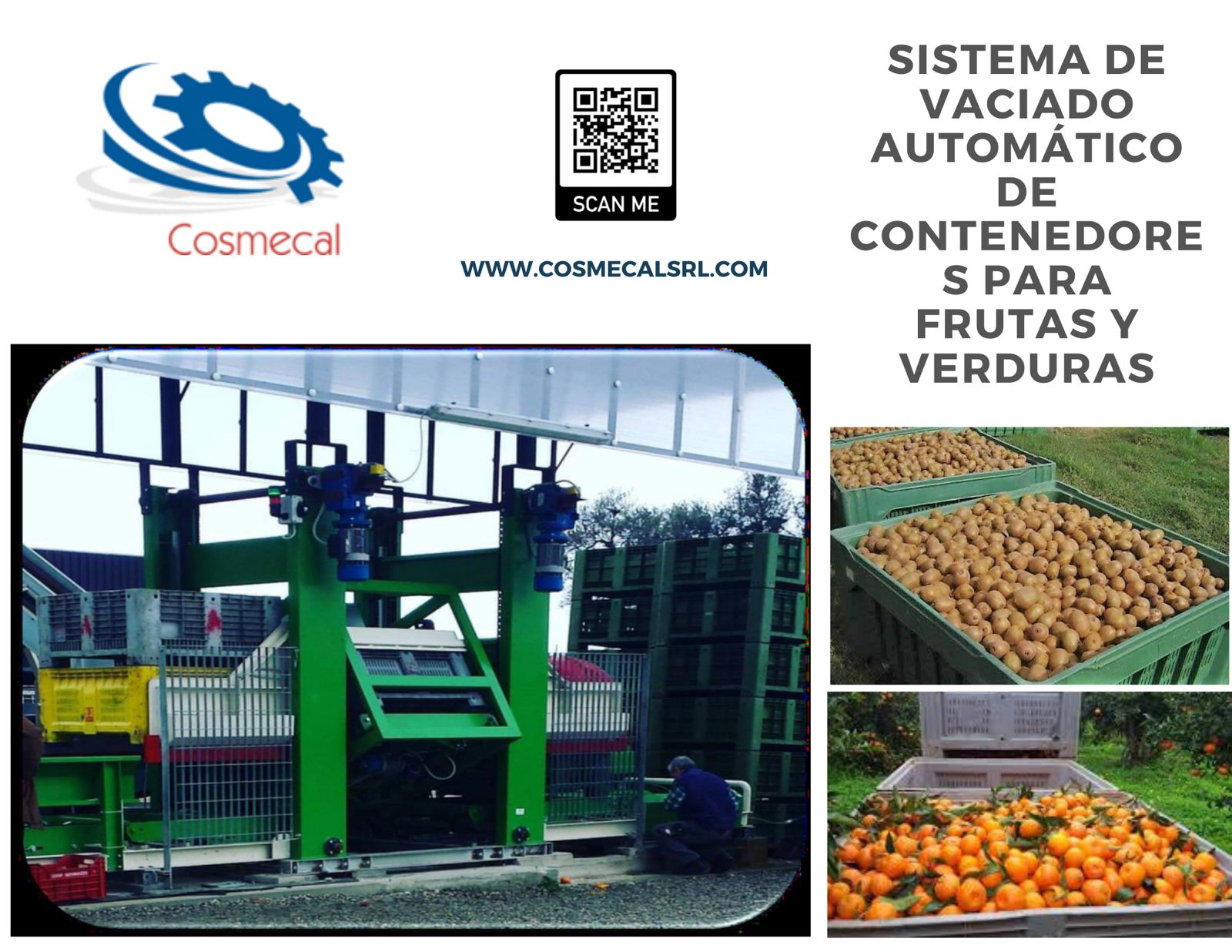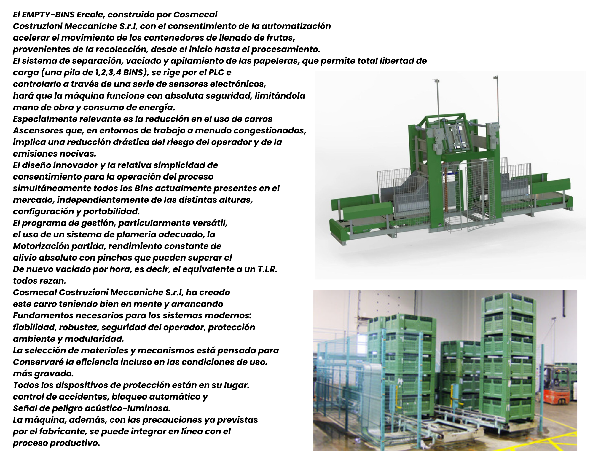 El EMPTY-BINS Ercole, construido por Cosmecal Costruzioni Meccaniche S.r.l, con el consentimiento de la automatización acelerar el movimiento de los contenedores de llenado de frutas, provenientes de la recolección, desde el inicio hasta el procesamiento. El sistema de separación, vaciado y apilamiento de las papeleras, que permite total libertad de carga (una pila de 1,2,3,4 BINS), se rige por el PLC e controlarlo a través de una serie de sensores electrónicos, hará que la máquina funcione con absoluta seguridad, limitándola mano de obra y consumo de energía. Especialmente relevante es la reducción en el uso de carros Ascensores que, en entornos de trabajo a menudo congestionados, implica una reducción drástica del riesgo del operador y de la emisiones nocivas. El diseño innovador y la relativa simplicidad de consentimiento para la operación del proceso simultáneamente todos los Bins actualmente presentes en el mercado, independientemente de las distintas alturas, configuración y portabilidad. El programa de gestión, particularmente versátil, el uso de un sistema de plomería adecuado, la Motorización partida, rendimiento constante de alivio absoluto con pinchos que pueden superar el De nuevo vaciado por hora, es decir, el equivalente a un T.I.R. todos rezan. Cosmecal Costruzioni Meccaniche S.r.l, ha creado este carro teniendo bien en mente y arrancando Fundamentos necesarios para los sistemas modernos: fiabilidad, robustez, seguridad del operador, protección ambiente y modularidad. La selección de materiales y mecanismos está pensada para Conservaré la eficiencia incluso en las condiciones de uso. más gravado. Todos los dispositivos de protección están en su lugar. control de accidentes, bloqueo automático y Señal de peligro acústico-luminosa. La máquina, además, con las precauciones ya previstas por el fabricante, se puede integrar en línea con el proceso productivo.