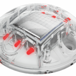 Tacha lumínica de carga solar, fabricada en policarbonato cristal. Está provista con fotocélula para encendido automático, 3 leds por lado, un microprocesador, memorias RAM, ROM y EPROM, así también con diferentes entradas y salidas digitales y analógicas, todo en un mismo encapsulado. La tacha solar trabaja de distintas maneras según el programa de su necesidad, intermitente, lento y rápido, tipo faro o circular, tipo baliza, luz fija, entre otros. Posee voltaje de 3,7 volt., potencia máxima de 1,2 watt, tiempo promedio de trabajo nocturno de 12/18 horas y un tiempo de carga de 6 horas. Su base tiene Ø 12,5 cm de diámetro y 2,5 cm de altura. Cuenta con 2 orificios de Ø 10 mm para fijación con anclaje mecánico al suelo.