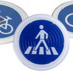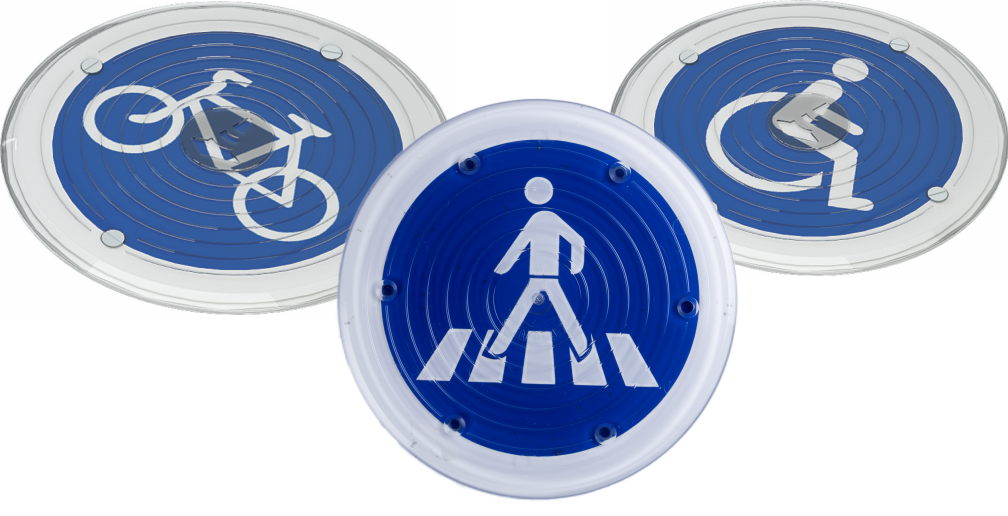 Tacha circular plana de señalización para sendas y carriles peatonales, fabricada en material acrílico. Diseño de logo o señal a elección, de 1 a 3 colores. Su diámetro es de 20 cm y una altura de 0,6 cm. Cuenta con 4 orificios para fijación con anclaje mecánico al suelo. Producto No apto para tránsito vehicular.